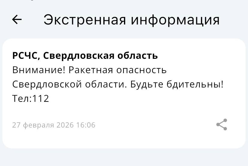 «РСЧС, Свердловская область. Внимание! Ракетная опасность Свердловской области! Будьте бдительны, 112».